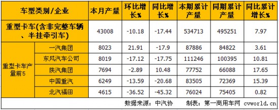 8月份重型卡車(含非完整車輛、半掛牽引車)銷量前5的企業(yè)依次為:東風(fēng)汽車公司(9949輛)、一汽集團(tuán)(7999輛)、中國重汽(7897輛)、陜汽集團(tuán)(7675)和北汽福田(5924輛),5家合計(jì)銷售39444輛,占重型卡車(含非完整車輛、半掛牽引車)8月總銷量48126輛的81.96%。