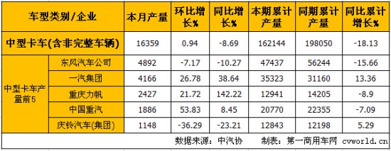 8月份中型卡車(含非完整車輛)產(chǎn)量前5的企業(yè)依次為:東風(fēng)汽車公司(4892輛)、一汽集團(tuán)(4166輛)、重慶力帆(2427輛)、中國重汽(1886輛)和慶鈴汽車(1148輛),5家合計(jì)生產(chǎn)14519輛,占中型卡車(含非完整車輛)總產(chǎn)量16359輛的88.75%。由上表可見,8月產(chǎn)量第2、3、4位的一汽集團(tuán)、重慶力帆和中國重汽三家企業(yè)實(shí)現(xiàn)環(huán)比、同比雙正增長。